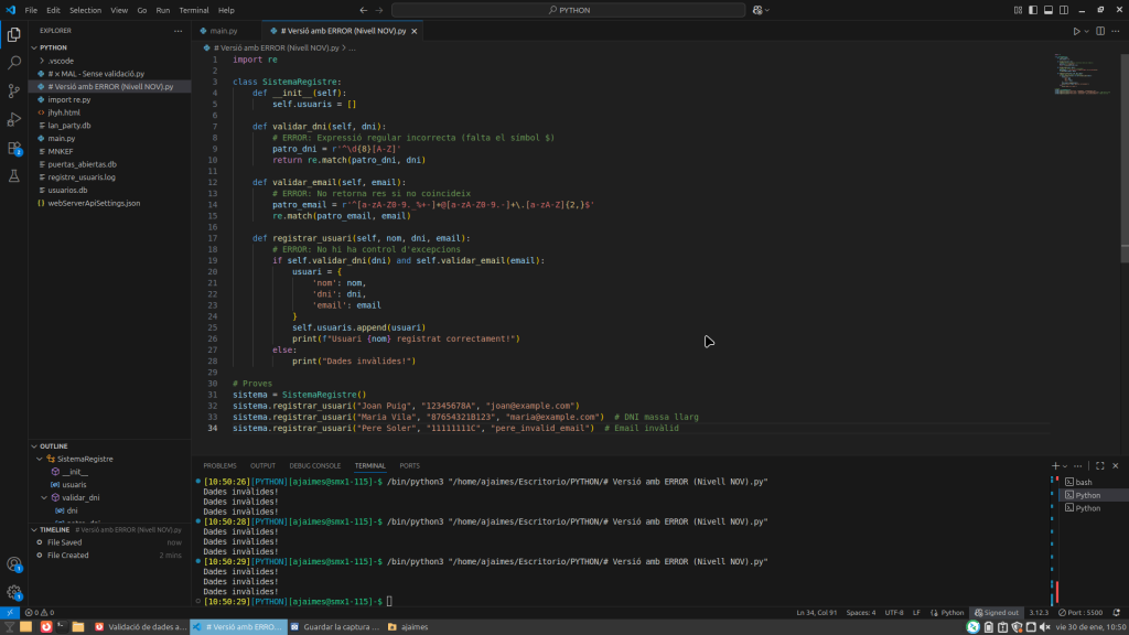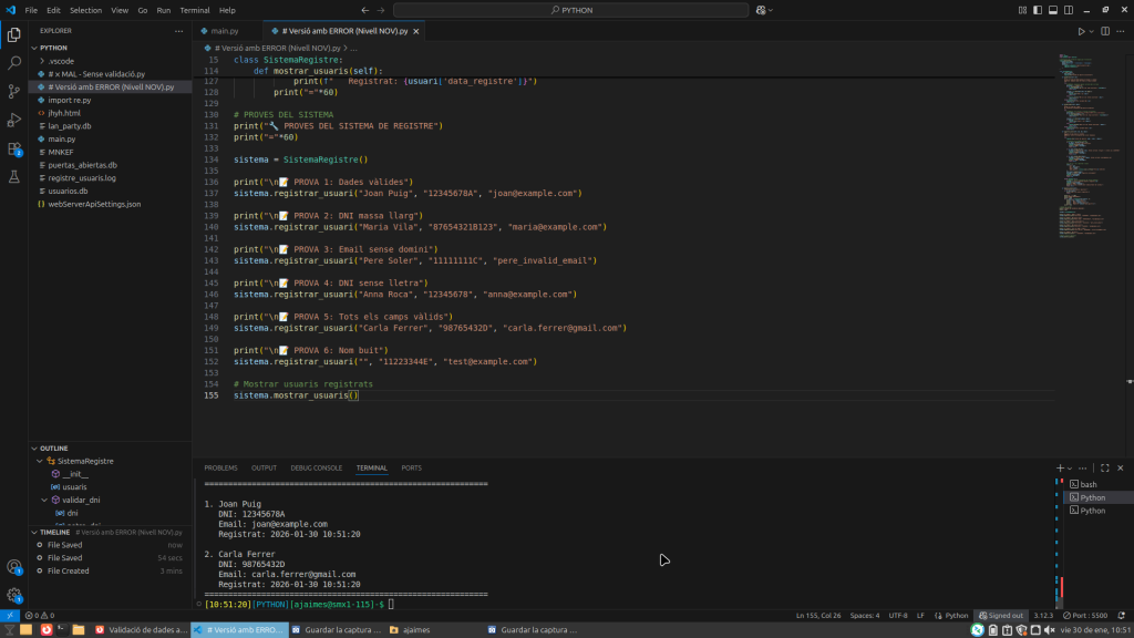 En aquest exercici s’ha dut a terme un procés de depuració d’un sistema de registre en Python. L’objectiu ha estat transformar un codi inestable i vulnerable en una aplicació robusta i professional .Aquest procés no només s’ha centrat a corregir errors de sintaxi, sinó a millorar la seguretat de les dades, la traçabilitat del sistema i l’experiència de l’usuari finl.
