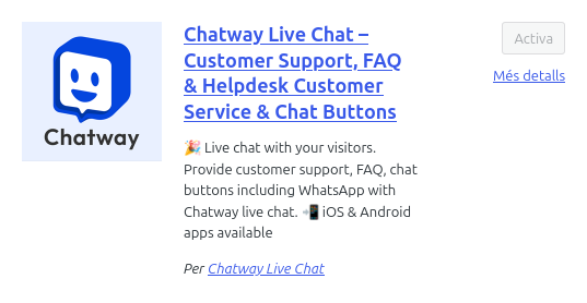 Chatway Live Chat és un plugin que afegeix una finestra de xat en viu al lloc web. Gràcies a aquest plugin, els visitants poden escriure missatges en temps real i rebre resposta directament des del tauler d’administració. S’ha configurat amb colors corporatius, un missatge de benvinguda personalitzat i notificacions per correu electrònic quan arriba un nou missatge. Això millora l’atenció a l’usuari i facilita la comunicació directa amb el visitant.