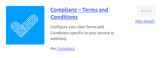 Complianz és un plugin que genera automàticament la pàgina de Termes i Condicions del lloc web, adaptada a la legislació vigent. Mitjançant el seu assistent de configuració, s’han introduït les dades del tipus de negoci i els serveis oferts, i el plugin ha creat el document legal de forma automàtica. Aquesta pàgina ha estat afegida al peu del lloc web per garantir el compliment normatiu.