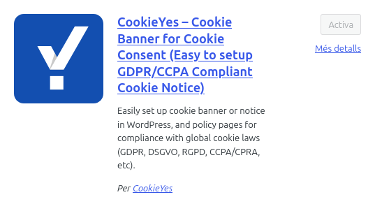 CookieYes gestiona el consentiment de galetes (cookies) d’acord amb el Reglament General de Protecció de Dades (RGPD) de la Unió Europea. El plugin ha escanejat automàticament el lloc per detectar totes les cookies en ús i les ha categoritzat en necessàries, analítiques i de màrqueting. S’ha configurat un bàner de consentiment que apareix als nous visitants, permetent-los acceptar o rebutjar les cookies.