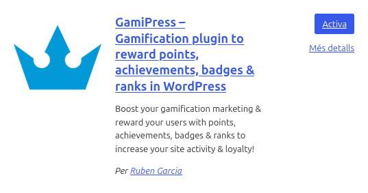 GamiPress és el sistema de gamificació més flexible i potent per a WordPress. Permet afegir punts d’experiència, insignies i rangs per recompensar els usuaris quan realitzen accions al lloc web. S’ha configurat amb tres rangs (Principiant, Intermedi i Avançat) i s’han definit les accions que atorguen punts, com el registre o la visita a pàgines. Això incentiva la participació i el retorn dels usuaris.