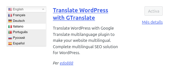 GTranslate afegeix traducció automàtica al lloc web mitjançant la tecnologia de Google Translate. S’ha configurat un selector d’idioma a la capçalera del lloc amb les opcions de català, castellà, anglès, francès i alemany. El plugin permet als visitants de qualsevol país llegir el contingut en el seu idioma, ampliant l’abast del lloc web a nivell internacional.