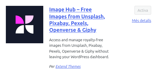 Image Hub permet accedir a biblioteques d’imatges gratuïtes i lliures de drets com Unsplash, Pixabay, Pexels, Openverse i Giphy directament des del tauler de WordPress, sense haver de sortir de l’editor. S’ha utilitzat per trobar i inserir imatges de qualitat professional a les pàgines del lloc web, estalviant temps i garantint que totes les imatges tenen la llicència adequada.