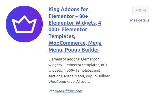 King Addons és un paquet de més de 4.000 plantilles i widgets addicionals per a Elementor. Amplia les possibilitats de disseny amb elements avançats com carrusels de testimonis, comptadors animats, mega menús, popups i molt més. S’ha utilitzat per enriquir el disseny de les pàgines del lloc, afegint elements visuals dinàmics que milloren l’experiència de l’usuari.