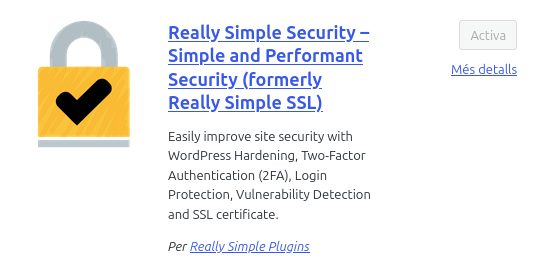 Really Simple Security és un plugin de seguretat avançada que implementa tres capes de protecció fonamentals: l’activació forçada del certificat SSL (HTTPS), l’autenticació en dos factors (2FA) per als administradors i la protecció de l’inici de sessió limitant els intents fallits. S’ha executat l’assistent de configuració complet i s’han aplicat totes les recomanacions per maximitzar la seguretat del lloc.