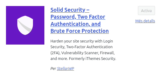 Solid Security Basic protegeix el lloc web contra atacs cibernètics canviant la URL d’accés a l’administrador per defecte, bloquejant les adreces IP que realitzen massa intents d’inici de sessió fallits i monitoritzant els canvis en els fitxers del nucli de WordPress. S’ha configurat amb una URL d’administrador personalitzada i s’han activat les notificacions de seguretat per correu electrònic.