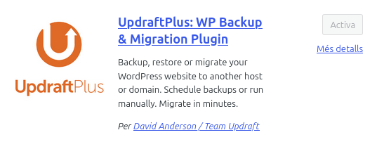 UpdraftPlus és el plugin de còpies de seguretat més popular de WordPress. Realitza còpies automàtiques de tots els fitxers i la base de dades del lloc i les envia a Google Drive com a emmagatzematge remot. S’ha configurat per fer còpies dels fitxers de forma setmanal i de la base de dades de forma diària. S’ha realitzat una prova de restauració per verificar que el procés funciona correctament.
