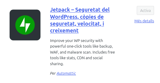 Jetpack és la suite d’eines més completa per a WordPress, creada per Automattic, els mateixos creadors de la plataforma. Inclou funcions de seguretat (protecció contra atacs de força bruta), rendiment (CDN per a imatges), estadístiques de visites i molt més. S’ha connectat amb un compte de WordPress.com i s’han activat les funcions de seguretat i el CDN d’imatges per millorar la velocitat de càrrega del lloc.