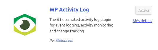 WP Activity Log genera un registre d’auditoria complet de tot el que succeeix al lloc web: qui ha iniciat sessió, quins canvis s’han fet i des de quina adreça IP. Funciona de manera similar al Syslog de Linux. S’ha configurat per monitoritzar els events crítics (canvis de rol, intents de sessió fallits, edicions de contingut) i s’han activat les alertes per correu electrònic per als events més importants.