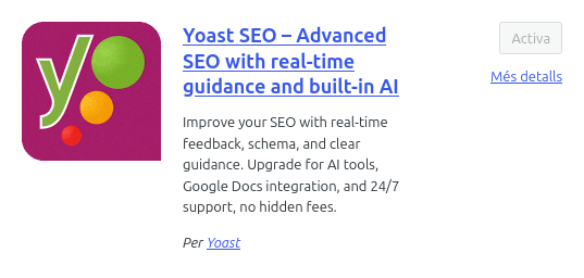 Yoast SEO és el plugin d’optimització per a motors de cerca (SEO) més complet i utilitzat de WordPress. S’ha configurat per a cada pàgina del lloc amb la paraula clau principal, el títol SEO i la metadescripció. A més, ha generat el mapa del lloc XML i l’ha enviat a Google Search Console. El plugin analitza la llegibilitat del contingut i proporciona suggeriments per millorar el posicionament del lloc web als resultats de Google.