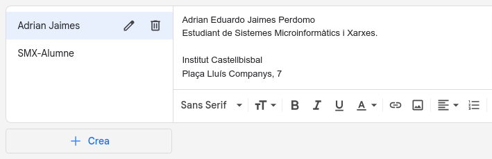 He preparat la meva firma al correu electrònic de la feina. Aquesta opció permet afegir informació bàsica o un missatge final de manera automàtica, ajudant a estalviar temps i a mantenir una presentació coherent.
