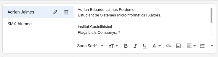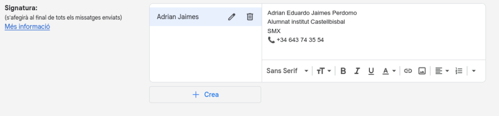 Fem clic a “Crea una nova” i escrivim el text que volem que aparegui automàticament al final dels nostres correus. Podem afegir només el nom i cognoms, o bé ampliar-ho amb dades com: