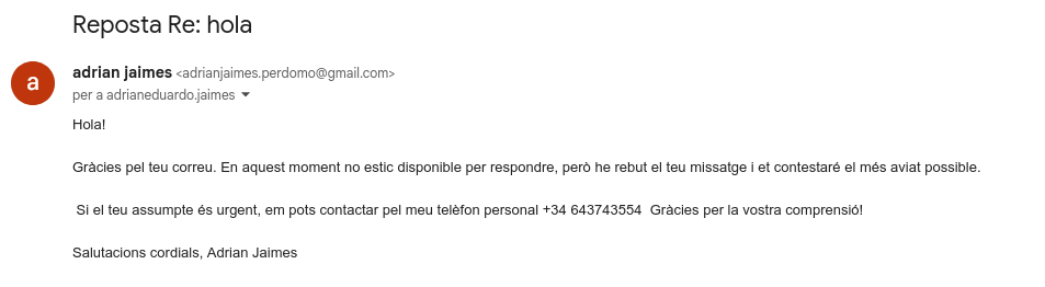 He activat la resposta automàtica al meu correu electrònic. Aquesta funció és molt pràctica perquè permet enviar un missatge predefinit de manera automàtica a totes les persones que ens escriuen, especialment útil quan no podem respondre personalment (per exemple, durant vacances o absències).
