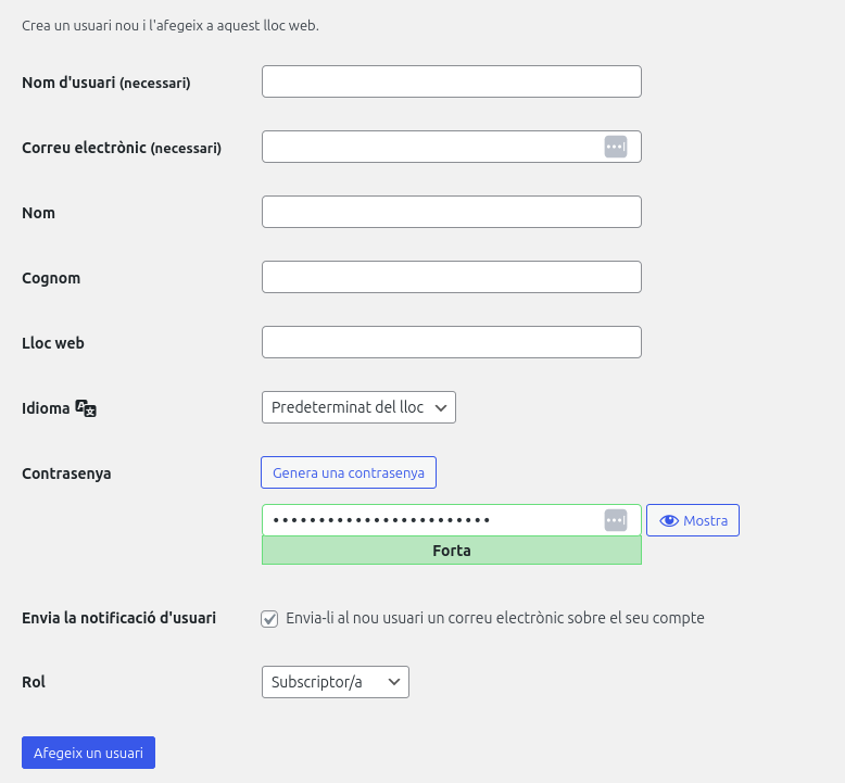 Completa els diferents camps amb les dades del nou usuari.